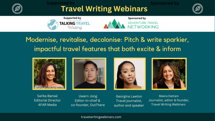 In this pre-recorded, one-hour webinar, Sarika Bansal, editorial director of AFAR Media, an award-winning print and digital publication focused on positive impact, experiential travel; Uwern Jong, editor-in-chief and co-founder of OutThere magazine, a luxury and experiential travel journal that began for the LGBTQ+ community and has evolved into a leading voice of inclusivity; Georgina Lawton, a travel journalist, speaker and author whose personal story is the subject of her first book, Raceless: In Search of Family, Identity, and the Truth About Where I Belong; speak to Meera Dattani (founder of Travel Writing Webinars and senior editor at Adventure.com).
